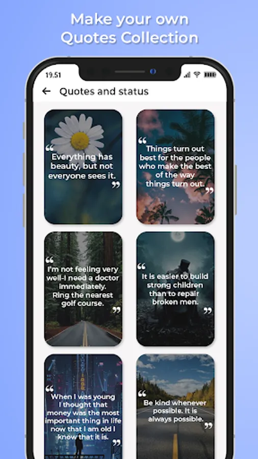 Would you like to post stories on social media apps? Quotes: Status Quotes & Social Media Quotes has a variety of quotes which can provide you quotes to put it on your stories. Quotes: Status Quotes & Social Media Quotes has many backgrounds images which you can select to set backgrounds on quotations.