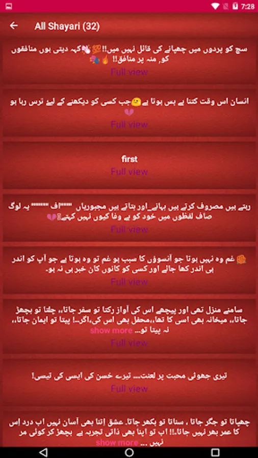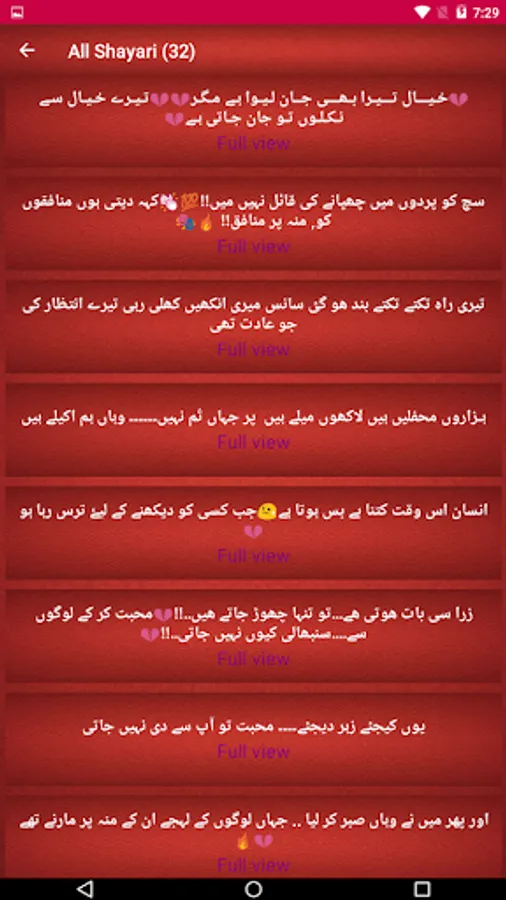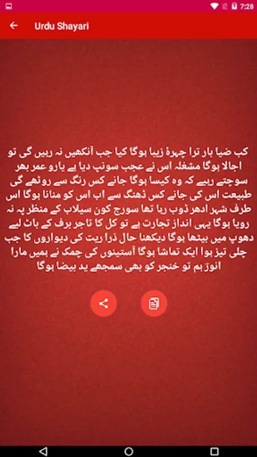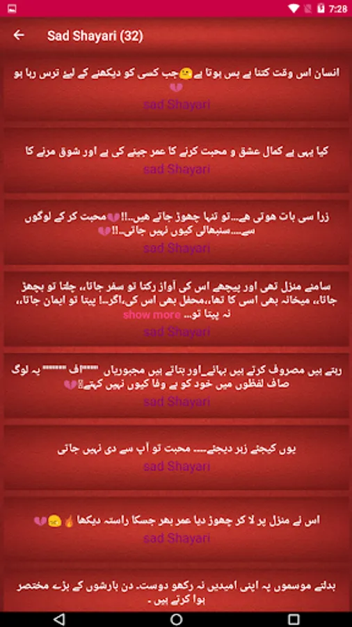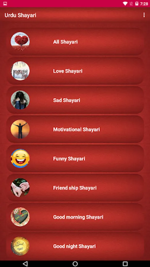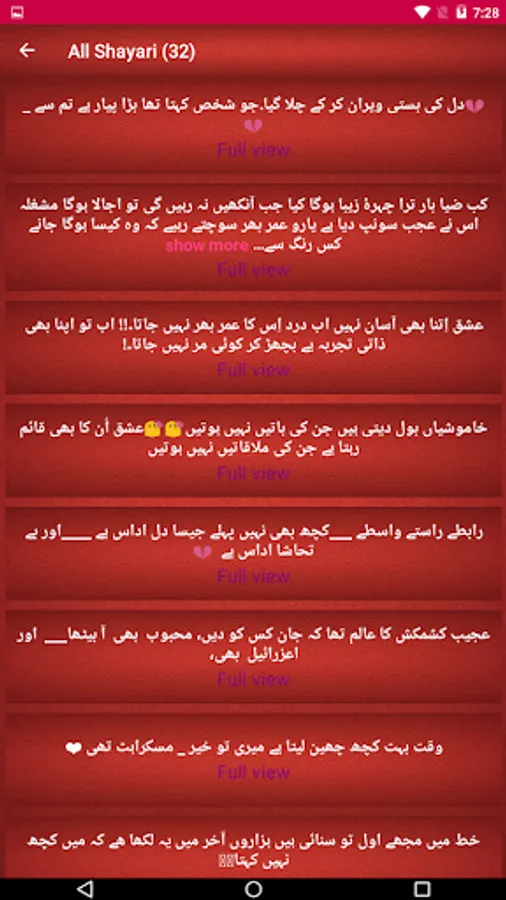 This Application Have Many Urdu Shayari You Can Share Copy You Can Easily Find & Read Your Favorite Type Of Urdu Poetry Here. You Can Easily Choose Which Category Of Urdu Poetry Or Urdu Status You Want To Read