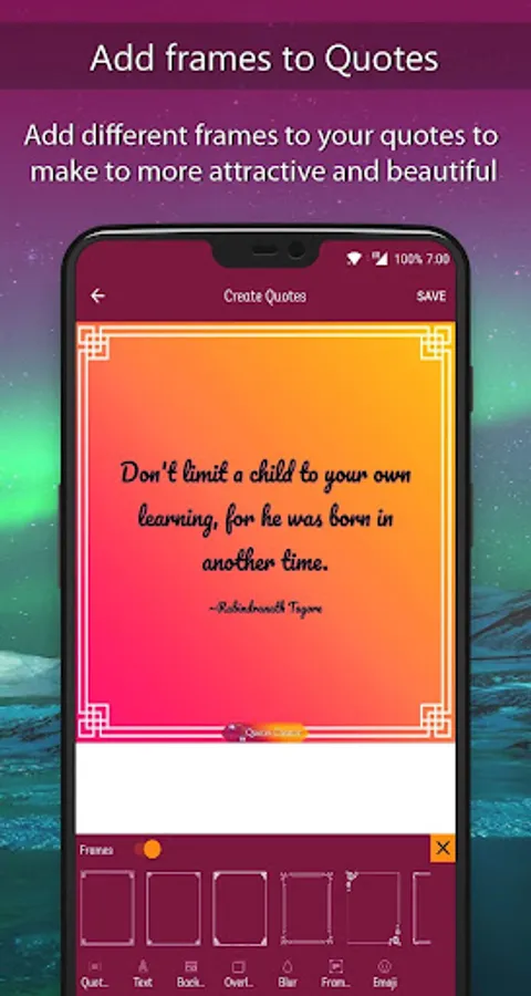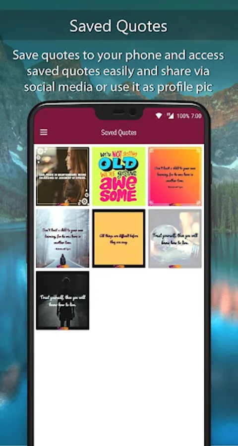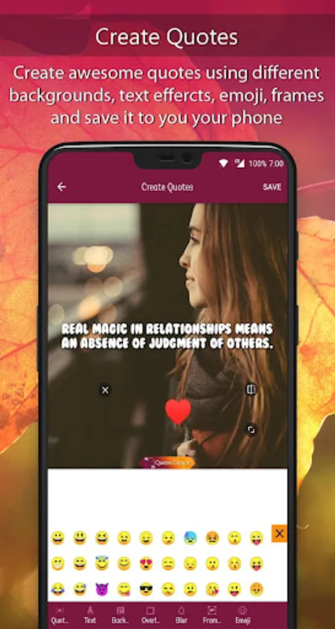 Quotes creator app has Large collection of famous picture quotes. you can add quotes to favorites and access them easily for later use. Share Quotes with friends or to your status.