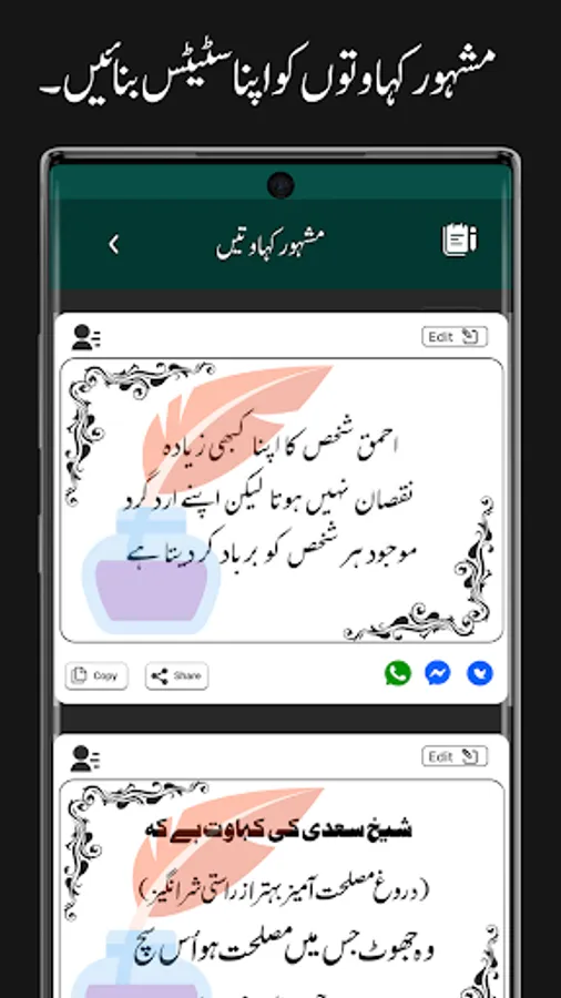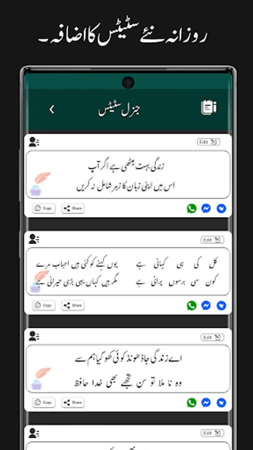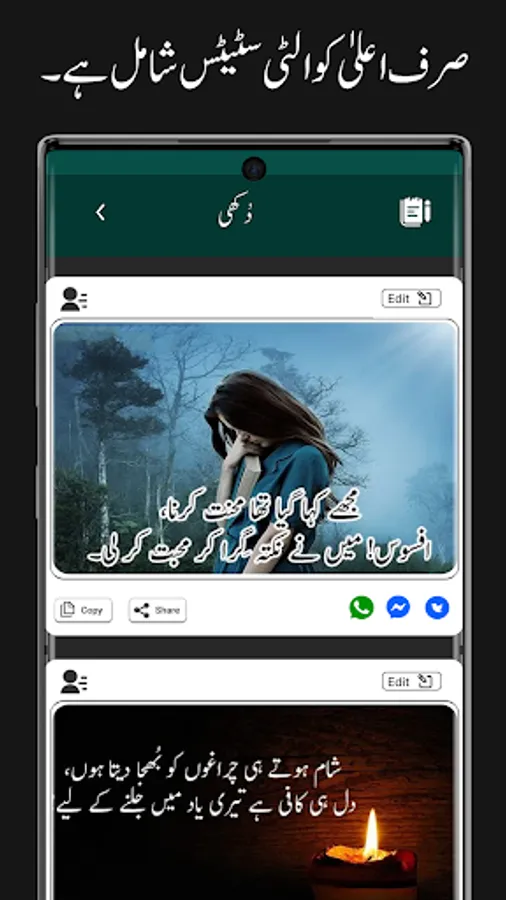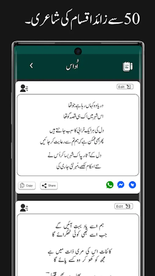 Urdu poetry and Urdu Shayari status app or Urdu sms Shayari on photos we provide you our best services. we daily update our Urdu status data bank regularly. you can find your best Urdu poetry status or Urdu Shayari and you have the option to share this on social media.