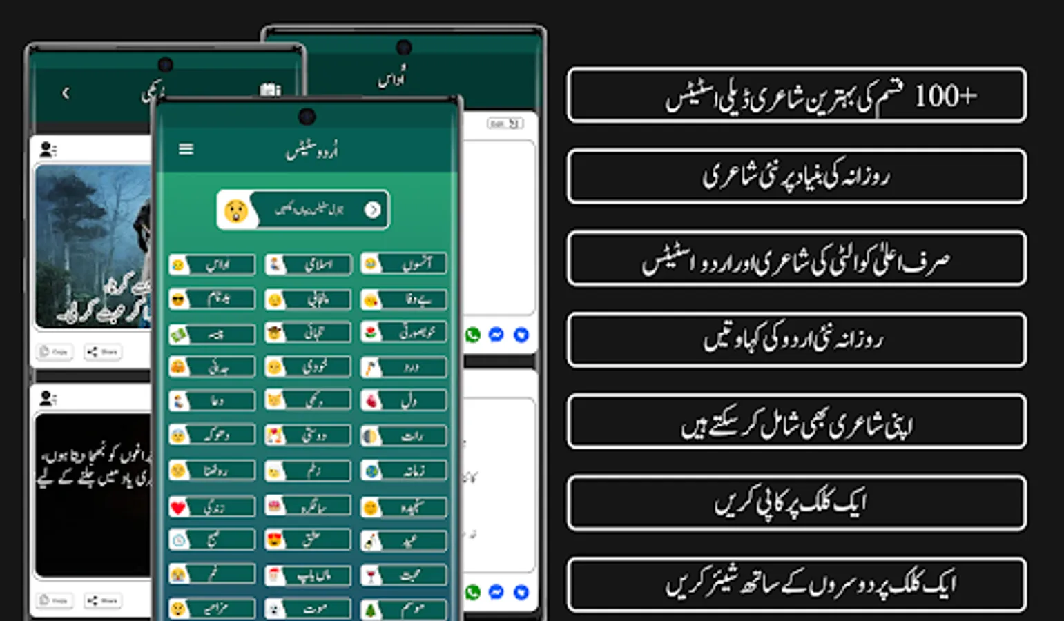 Urdu status sms poetry on photos app tries to provide you best functionalities. With this feature, you can use your best font styles, colors, and best emojis from different options. Fonts, colors, and Emojis make your conversation beautiful.