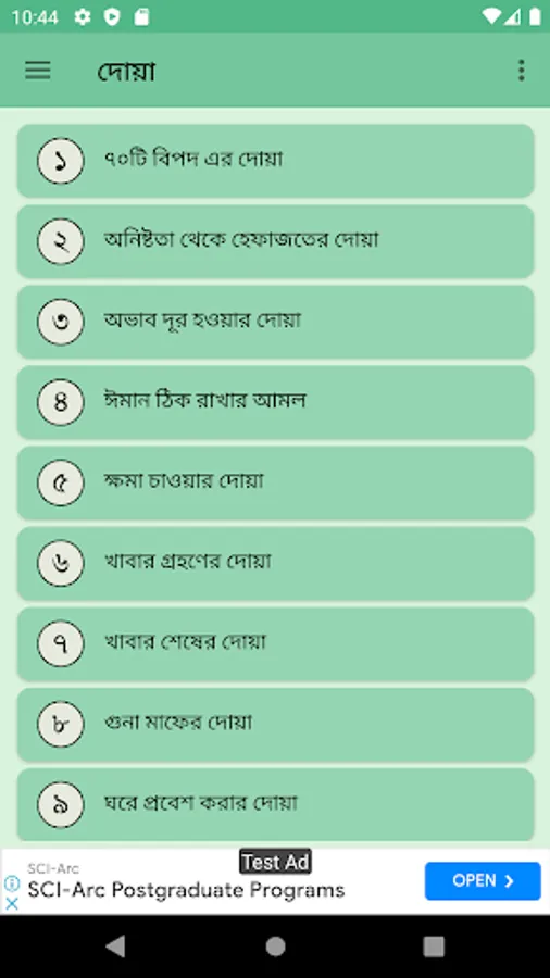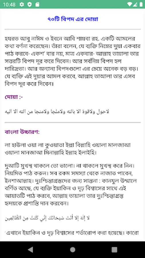 এখানে রয়েছে দৈনন্দিন জীবনের প্রয়োজনীয় দোয়া, বিপদ মুক্তির দোয়া, 132 খানা দো'আ, কোন দোয়া পড়লে কি হয় ও দোআ, বিপদ থেকে রক্ষার দোয়া। এছাড়া পরীক্ষায় পাস করার দোয়া, ফরয গোসলের সঠিক নিয়ম ও দোয়া, দোয়ায়ে কুনুত , জরুরী দোয়া, নামাযের দোয়া ও সূরা, মৃত মা বাবার জন্য দোয়া, গুনাহ মাফের দোয়া, ঘুমানোর আগে কিছু দোয়া ইত্যাদি রয়েছে।