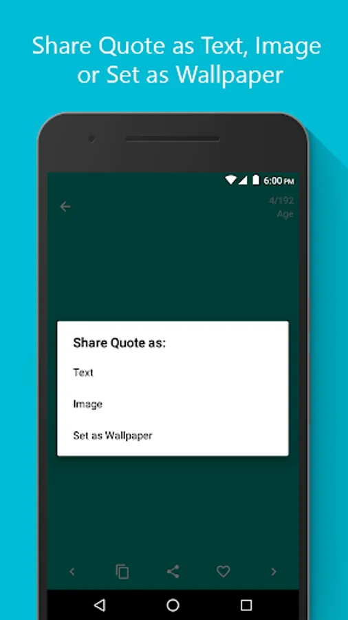 Set Quote as wallpaper with a single tap. Choose Share Quote with Set as Wallpaper and the Quote Image will be set as your wallpaper to keep you inspired.