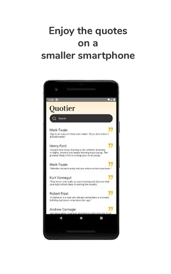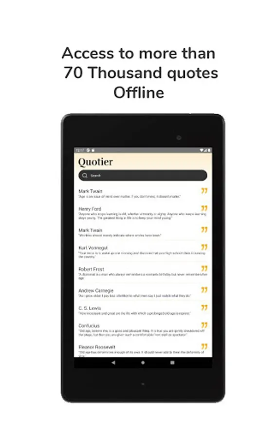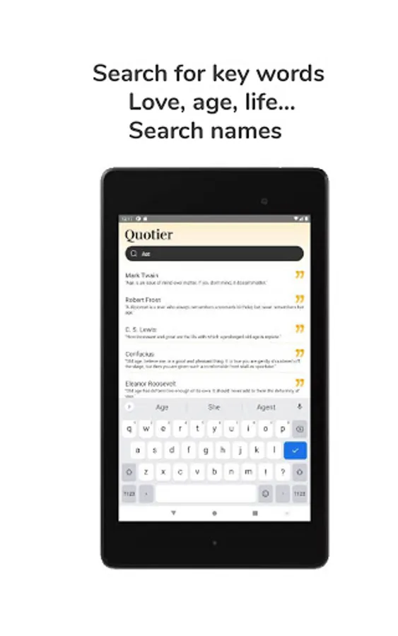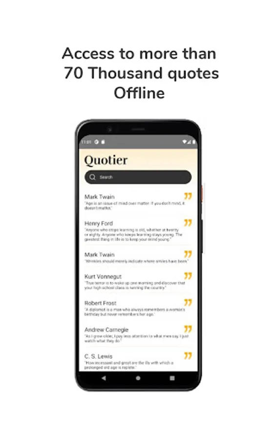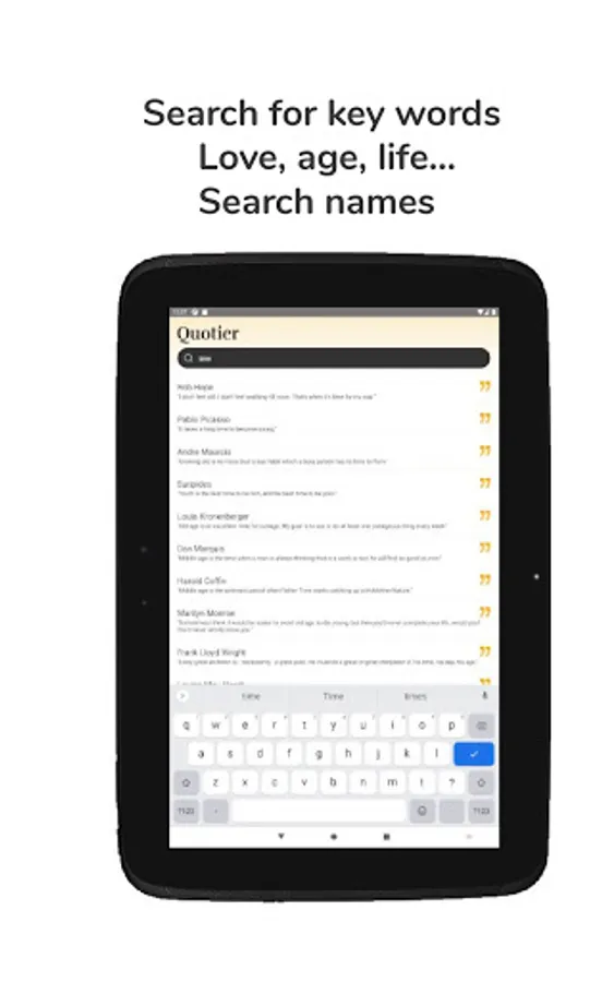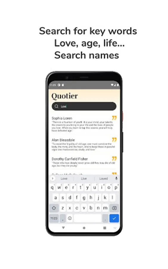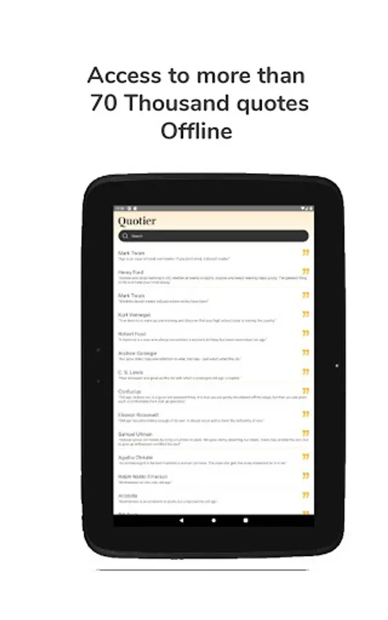 Jam packed with seventy thousand searchable quotes about Love, Life , Age, Time, Money and many more. All available offline. You can search quotes by name.