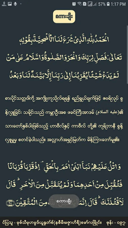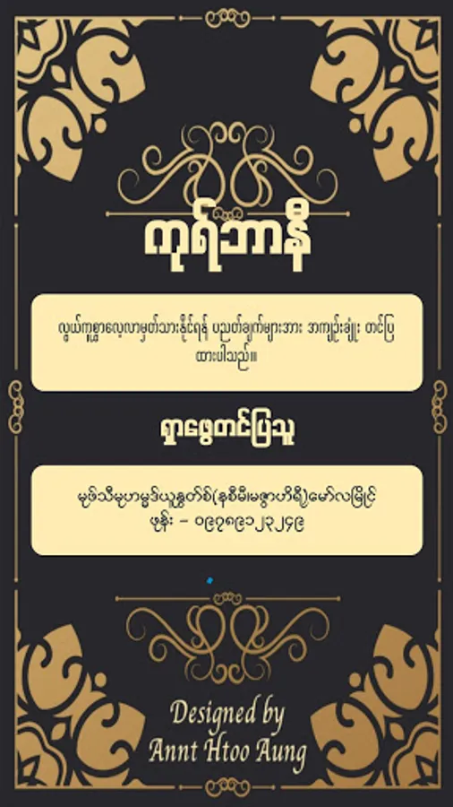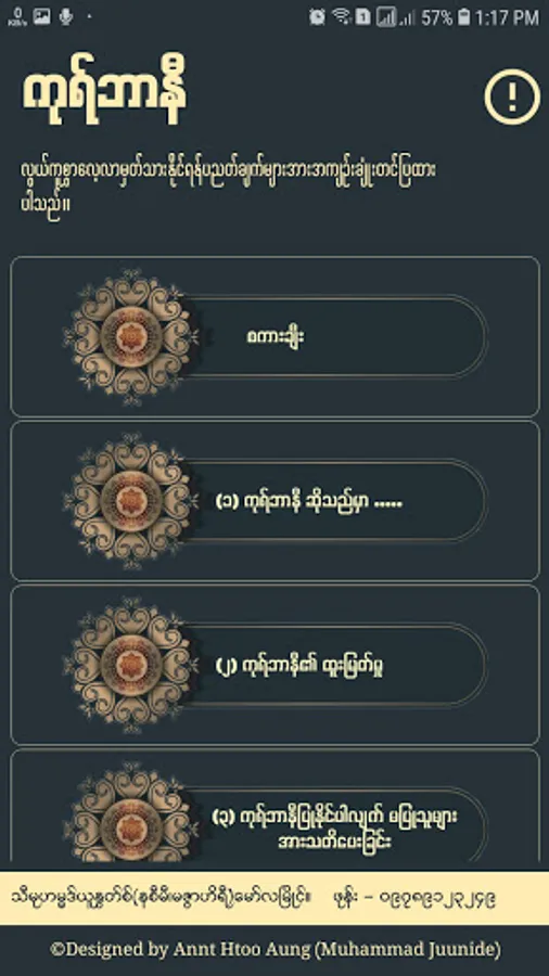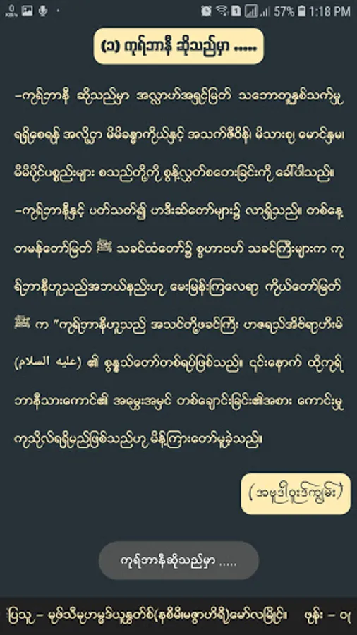ဤ Android Application မှ အကြောင်းအရာအားလုံးအား မုဖ်သီမုဟမ္မဒ်ယူနွတ်စ် (မဇွာဟိရီ)-မော်လမြိုင် ရေးသားပြုစုထားသော "ကုရ်ဗာနီ" ဟူသည့်ကျမ်းငယ်မှ ကူးယူဖော်ပြထားပါသည်။