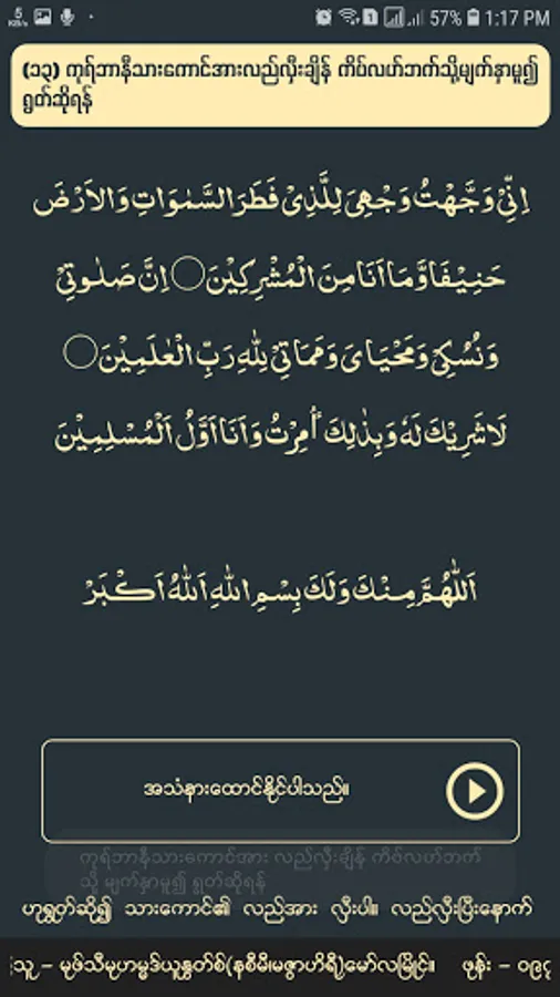 အဆိုပါ ကုရ်ဘာနီစာအုပ်အား Android Application အဖြစ် ပြုလုပ်ရန် ခွင့်ပြုပေးခဲ့သော မုဖ်သီ မုဟမ္မဒ် ယူနွတ်စ်(မဇွာဟိရီ) နှင့်တကွ ၎င်း၏မိသားစုအား အလ္လာဟ်အရှင်မြတ်သခင် နှစ်ဘဝနှစ်ဌာနစလုံးတွင် ကောင်းမွန်သောအစားချီးမြှင့်ပါစေ။ ထပ်ဆင့်၍ Application အဖြစ်ဖန်တီးပေးခဲ့သော ကျွန်ုပ် မုဟမ္မဒ်ဂျူနိုက်ဒ်နှင့်တကွ ကျွန်ုပ်၏ မိသားစုအားလုံးကိုလည်း အလ္လာဟ်အရှင်မြတ်သခင် နှစ်ဘဝနှစ်ဌာနစလုံးတွင် ကောင်းမွန်သောအစားချီးမြှင့်ပါစေ။ ကွယ်လွန်သေဆုံးသွားကြသည့် မွတ်စ်လင်မ် အမျိုးသားအမျိုးသမီးအပေါင်းအားလည်း ဂျန္နသ်သုလ်ဖိရ်ဒေါင်းစ် ကို အလ္လာဟ်အရှင်မြတ်သခင် ချီးမြှင့်တော်မူပါစေ။ သက်ရှိထင်ရှားရှိနေသည့် အီမာန်ရှင်အပေါင်းအားလည်း အလ္လာဟ်အရှင်မြတ်သခင် နှစ်ဘဝနှစ်ဌာနလုံးတွင် အောင်မြင်မှုချီးမြှင့်ပြီး အီမာန်ကို အသက်ထက်ဆုံးထိန်းသိမ်းနိုင်စွမ်းချီးမြှင့်ပါစေ။ ဂျန္နသ်သုလ်ဖိရ်ဒေါင်းစ် တွင် တမန်တော်မြတ်ကြီး မုဟမ္မဒ်(ဆွ) ၏ အိမ်နီးနားချင်းများအဖြစ် ပြုလုပ်ပေးသနားတော်မူပါစေ။ (အာမီးန်)