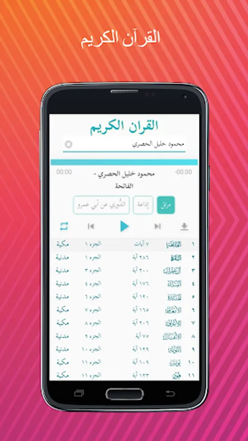 The application of the Holy Quran in full voice is a program through which you can listen to the entire Holy Quran, you can choose the reciter you want to listen to, after that the chapters of the Noble Qur’an appear for you, you can choose any chapter you want from it and control it with ease..