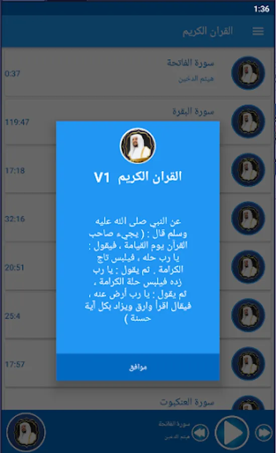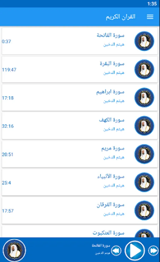 The application contains 30 parts of the Noble Qur’an and 114 Surahs in the narration of Hafs from Asim, recited by Sheikh Haitham Al-Dukhin as follows: