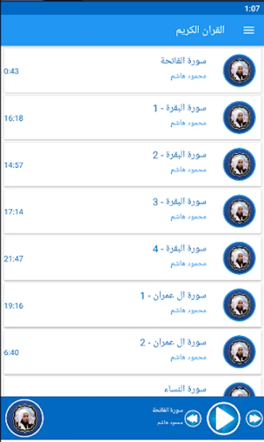 The application contains 30 parts of the Noble Qur’an and 114 Surahs in the narration of Hafs from Asim, recited by Sheikh Mahmoud Hashem as follows: