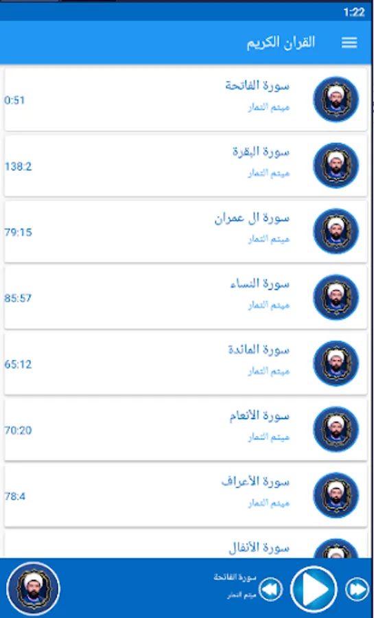 The application contains 30 parts of the Noble Qur’an and 114 Surahs in the narration of Hafs from Asim, recited by Sheikh Maytam Al-Tamar as follows: