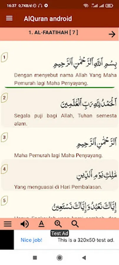 - Indonesian translation, translation options (Kemenag-RI and Tafsir Al Jalalain Indonesia).