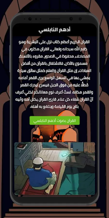 You will find all this and more in the application of the Quran with the voice of Adham Al-Nabulsi, which is characterized by an easy and quick interface to use, and the application of the Quran is distinguished by the voice of Adham Al-Nabulsi, daily updates and the addition of new Islamic backgrounds and Quranic verses with the voice of Adham Al-Nabulsi, so what are you waiting for! Download the Quran application with the voice of Adham Al-Nabulsi, to enjoy the voice of Adham Al-Nabulsi, and do not forget to evaluate the application of the Quran with the voice of Adham Al-Nabulsi.