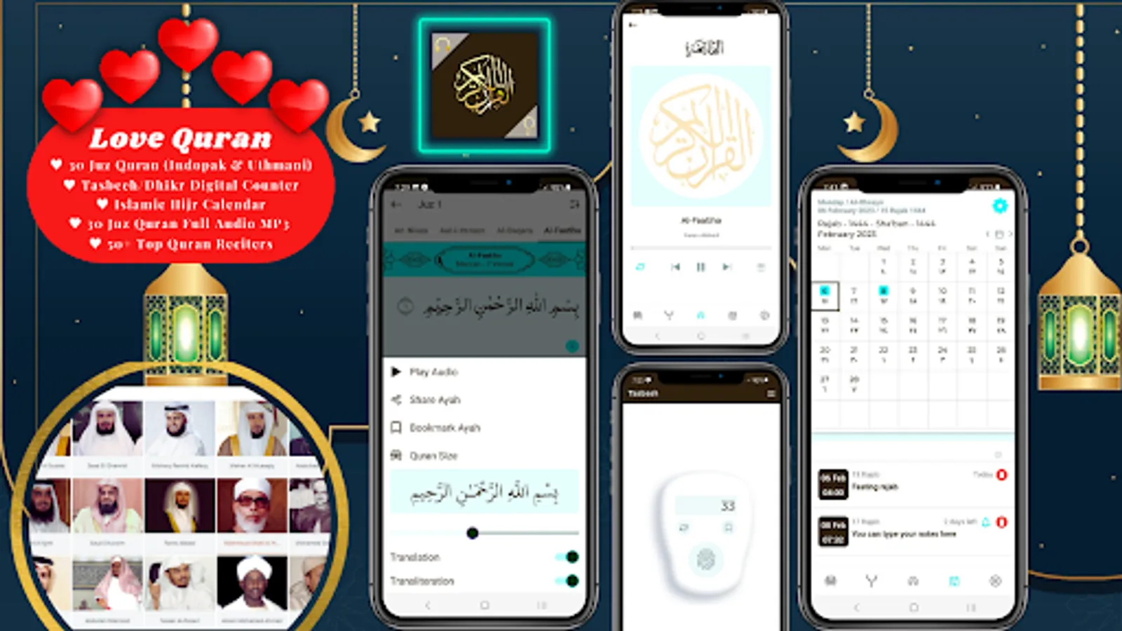 Quran full audio 30 juz with tasbeeh/dhikr/tasbih digital counter, islamic calendar with hijri date and note reminder feature, murottal/qiraat quran by top qories in quran audio player. More features: