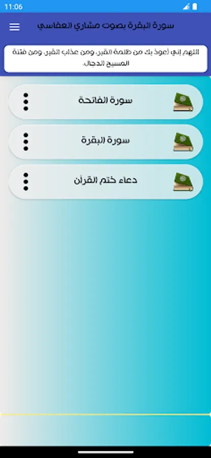 The application of Surat Al-Baqarah without the Internet by Sheikh Mishari bin Rashid Al-Afasy is a distinguished application with its simple interface in operation and provides automatic and random playback according to the user’s choice. It also provides the possibility of sharing audio files with others and also using them as ringtones or phone alarms and other features.