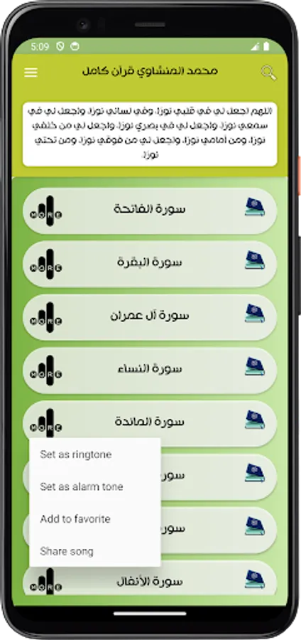The application of the Noble Qur’an with the voice of Muhammad Siddiq Al-Minshawi allows you to hear all the surahs of the Holy Qur’an through your mobile phone or tablet with ease and ease through one program that contains all the surahs of the Holy Qur’an. Store for Android phones. And you can download the application of the Noble Qur’an with the voice of Muhammad Siddiq Al-Minshawi with ease, so that you can enjoy reciting the Noble Qur’an with the voice of Sheikh Muhammad Siddiq Al-Minshawi wherever you want.