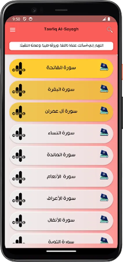 The application of the Noble Qur’an with the voice of Tawfiq Al-Sayegh allows you to hear all the surahs of the Holy Qur’an through your mobile phone or tablet with ease and ease through one program that contains all the surahs of the Holy Qur’an. android. And the Holy Quran application can be downloaded with the voice of Tawfiq Al-Sayegh with ease, so that you can enjoy reciting the Noble Qur’an with the voice of Sheikh Tawfiq Al-Sayegh wherever you want.