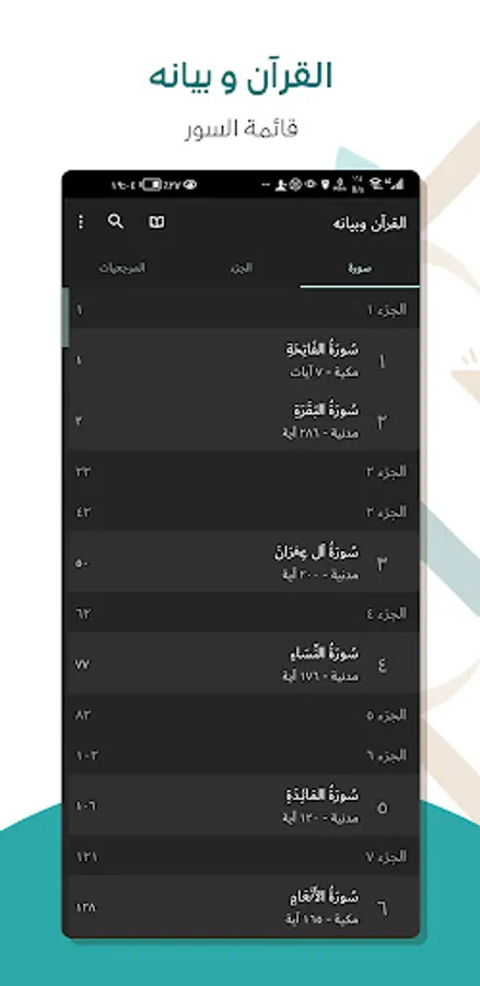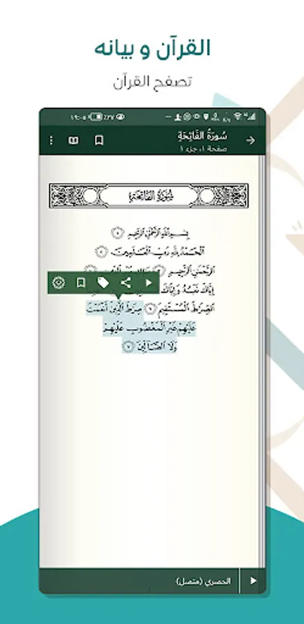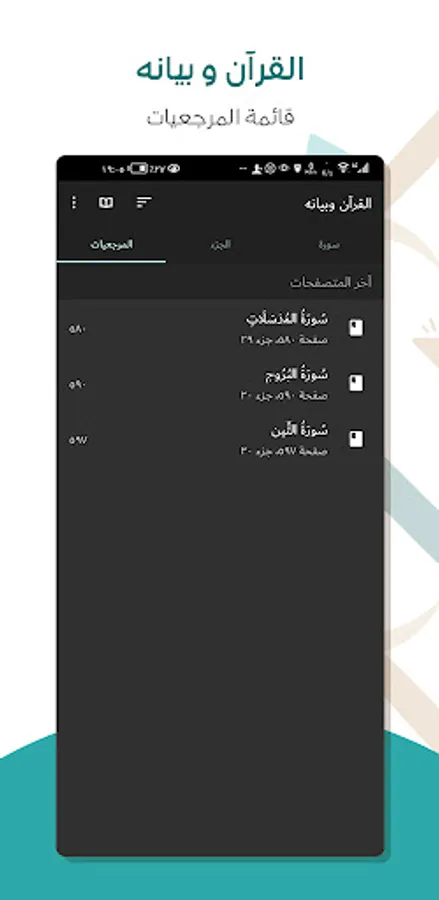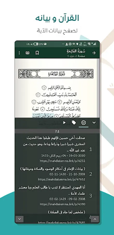Through the application, you can read the Qur’an and save reference marks for later reference to where you placed them, whether for the surah or the verse, with the possibility of copying and sharing verses