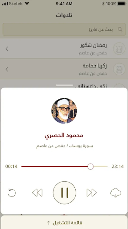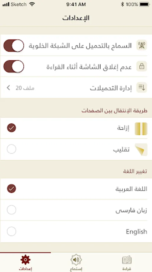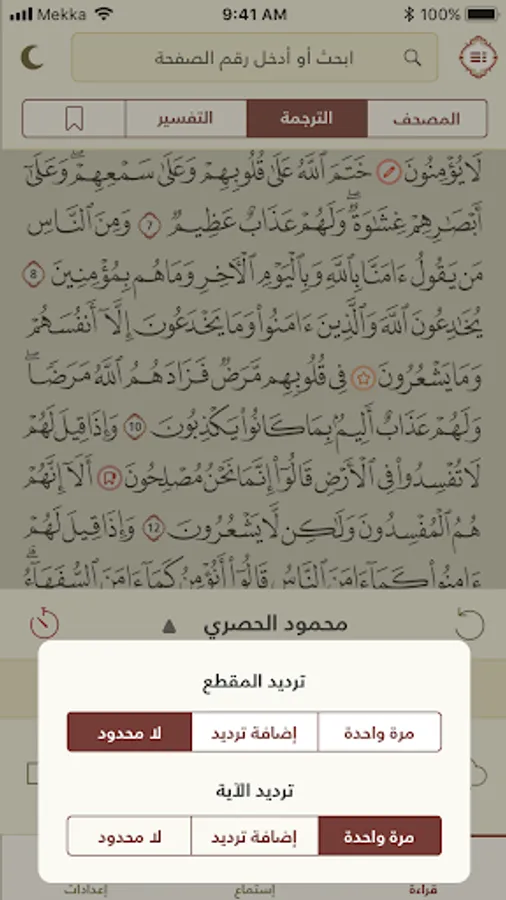 - Downloading a surah or a complete Mushaf to listen while being offline.