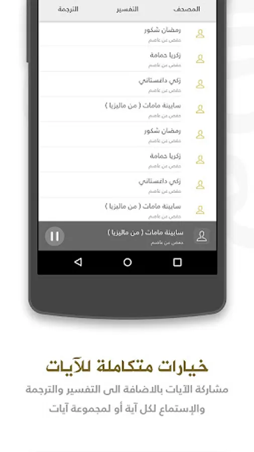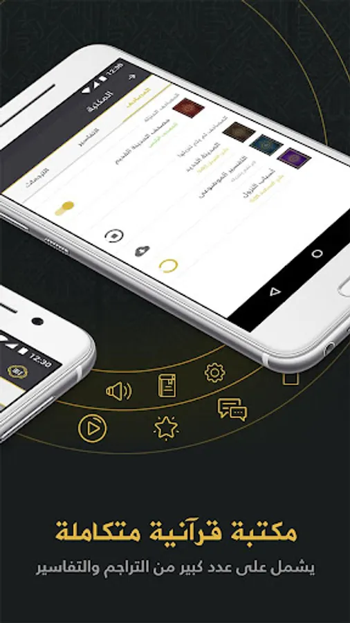 اختيار نوعية المصحف، الترجمات والتفاسير من بين الكتب المتاحة في المكتبة الخاصة بالتطبيق.