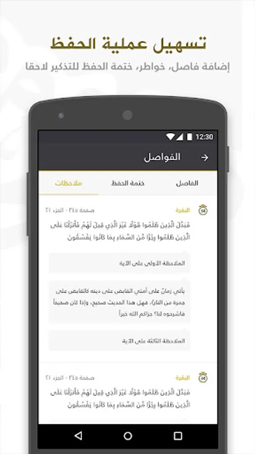 تدوين خواطر على الآيات، للتدبُّر أثناء القراءة والاستماع، وحفظها في محفوظات التطبيق.