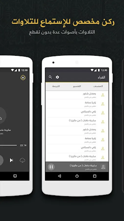 الاستماع إلى تلاوات القرآن بصوت أكثر من 100 قارئ من مشاهير القُراء، مع تظليل الآيات المتلوة لتلاوات 30 قارئ.