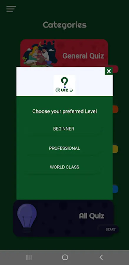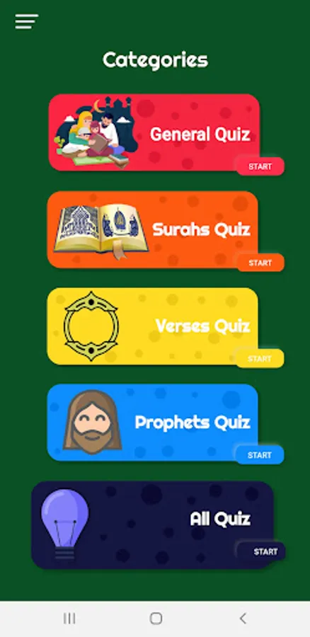 * 4 Categories: GENERAL Quiz - SURAHS Quiz - VERSES Quiz - PROPHETS Quiz