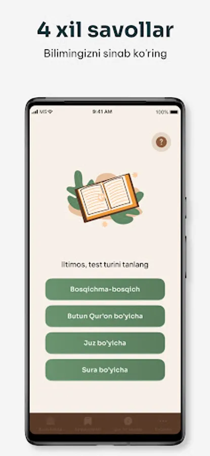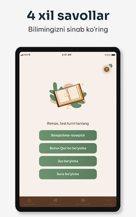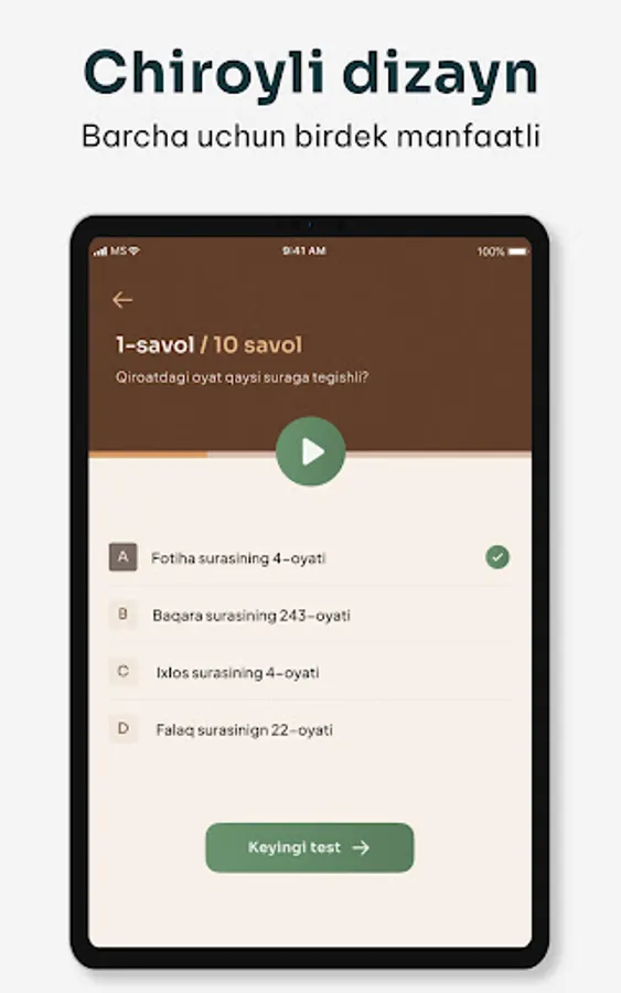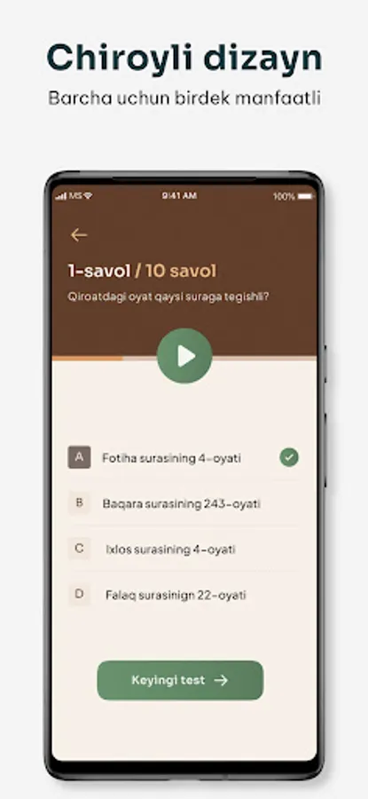 Ayat Quiz ilovasida o'zingizni sinab ko'ring.Qur'oni Karim oyatlarini eshiting va qaysi suraga tegishli ekanligini toping. Hozirda oyatlar faqat Fotiha surasi va o'ttizinchi poradan olingan.