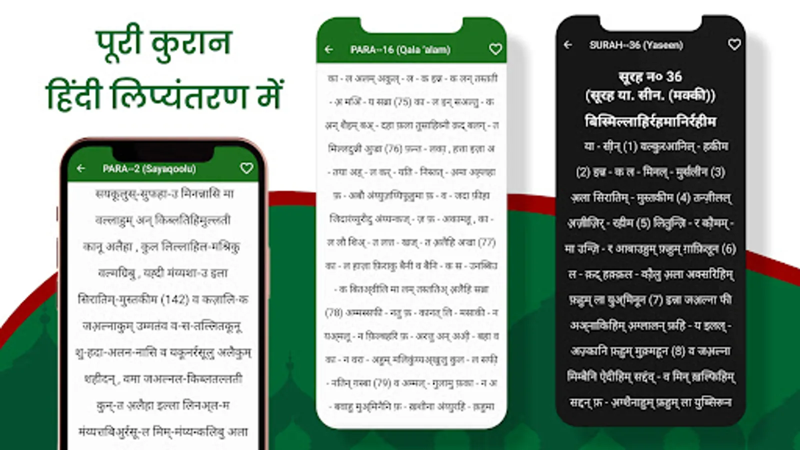 इस ऐप में Quran in Hindi Translation कुरान शरीफ हिंदी में तर्जुमा को 30 पारे कुरआन हिन्दी उच्चरण में अनुवाद के साथ दिया गया है । इसके अलावा 114 सूरह को हिन्दी उच्चरण में अनुवाद के साथ दिया गया है। इसके अलावा " दुआ - ए - ख़त्मे कुरआन " अनुवाद के साथ भी दिया गया है ।