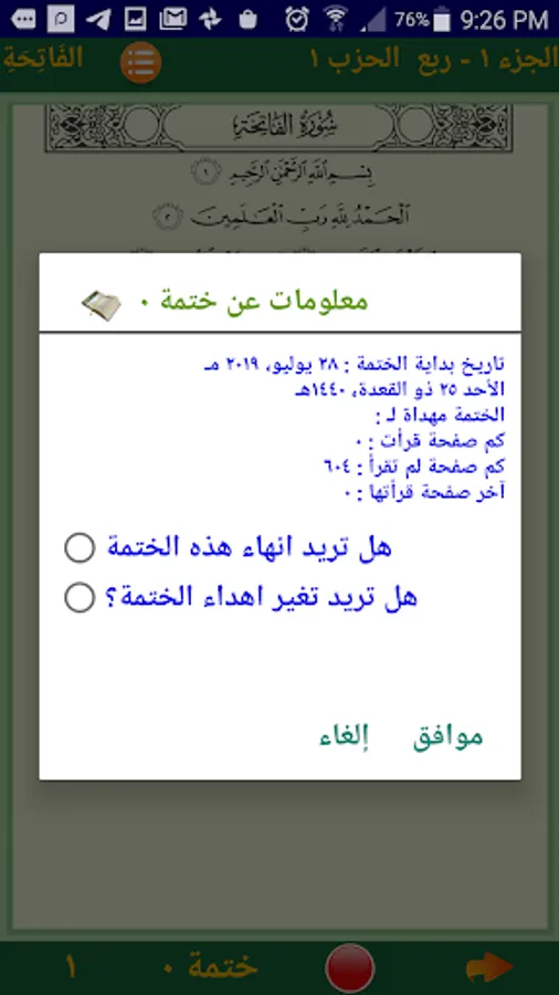 5- Display the closing information by clicking on the stamp number on the main reading page (the date of the beginning of the Gregorian and Hijri years, given to whom, how many pages have been read, how many pages have not been read, the last page you read) with the possibility to change the gift’s conclusion
