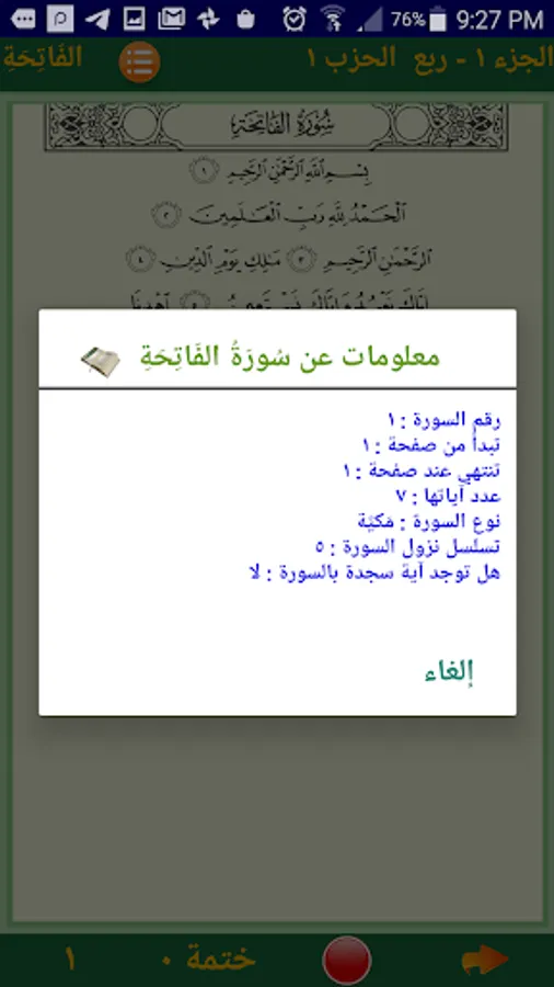 6- Displaying surah information by clicking on the surah name on the main reading page (number, start page and end page, number of verses, genre Meccan or civil, descending sequence, is there a prostration)