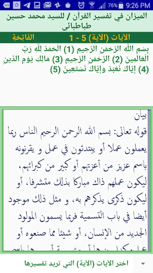 5- Interpretation button and by clicking on it you will see a page explaining the previously selected verse (according to the interpretation of the scale by Mr. Muhammad Hussein Tabatabaei, may God be above him)