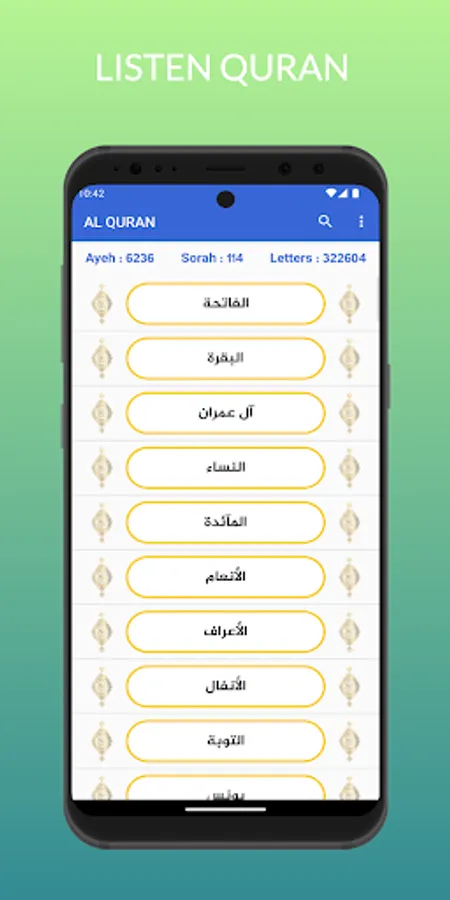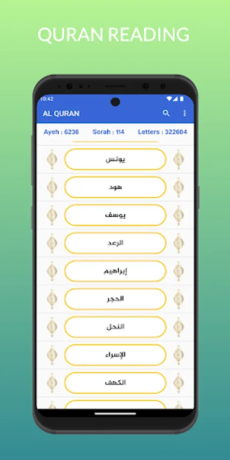 AlQuran 30 juz app includes 16 lines that seems to be a sufficient content to read with magnificent style. The Quranic words and verses are lined up in 16 lines on each page and that is attractive and pertains standardized readable font style and size. Complete Quran app is free for all.