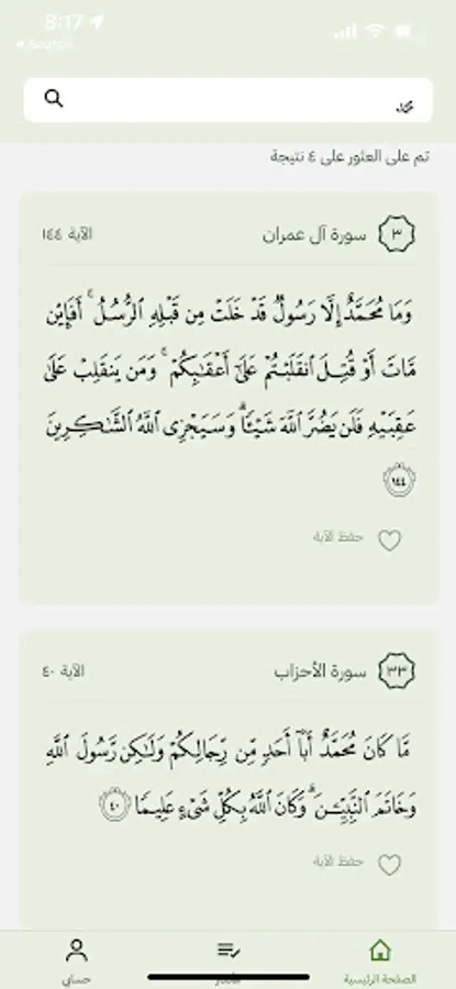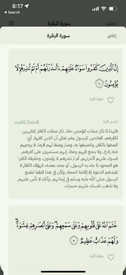 5- Search: The program provides the ability to search for words or sentences within the surah, and it also allows moving to a specific page, surah, or verse.