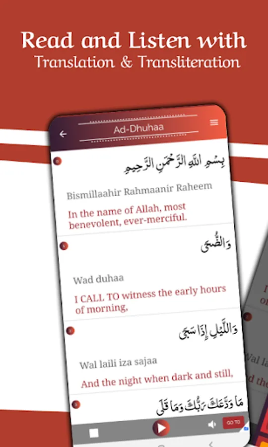 • Read Surah Ad Duha with Transliteration feature in English for those who cannot read Arabic.