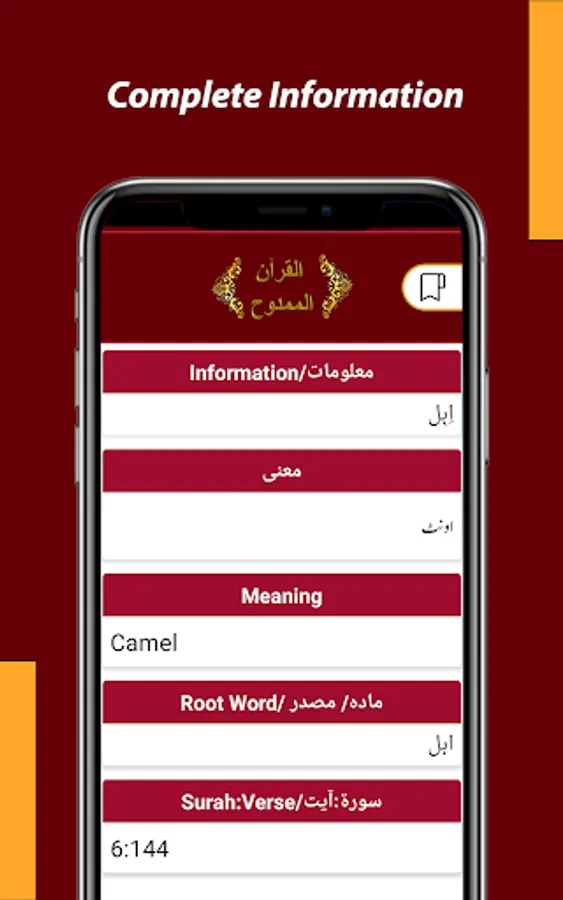 This Arabic dictionary provides the easiest way of conveying a message of the given information to the reader. You will find a word/phrase with its English and Urdu Translation along with its Ayah reference and its root.