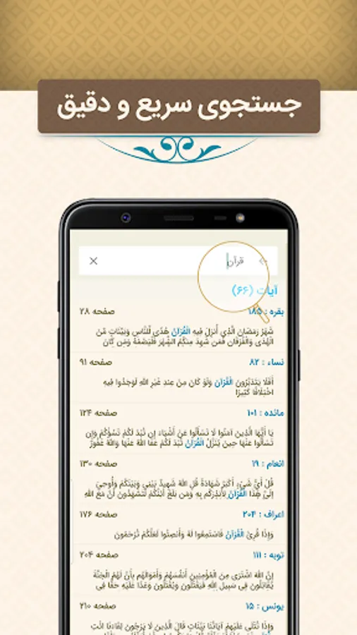 - Fast and accurate search of the texts of the Noble Qur’an and displaying the search results sorted by surah and page number.