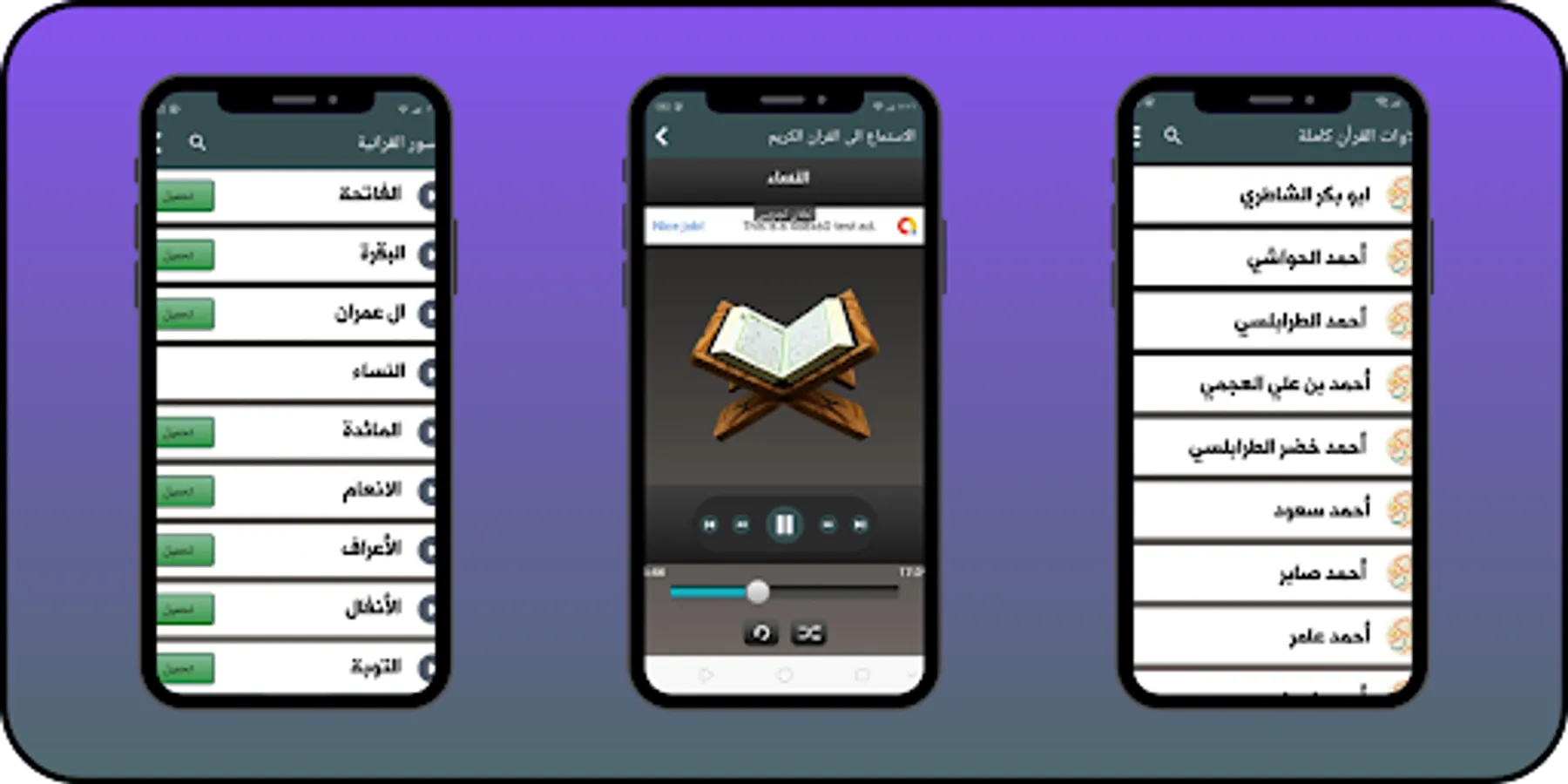 The application of prayer times, remembrances, and the Qur’an contains the voices of more than 30 sheikhs, including: Abu Bakr Al-Shatri, Maher Al-Muaiqly, Ahmed Saud, Idris Abkar, Ibrahim Al-Dosari, Saud Shuraim, Abdul Basit Abdul Samad, Abdul Rahman Al-Sudais, Ali Al-Hudhaifi, Muhammad Ayoub, Muhammad Siddiq Al-Minshawi. , Mahmoud Al-Rifai, Mishari Al-Afasy, Yasser Al-Dosari, Yahya Hawa.