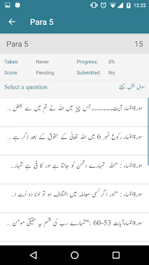 There are a total of 25 quizes which cover all 30 Paras of the Holy Quran.