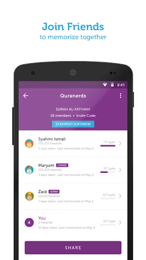 * Group challenges: The only Quran memorization app that lets you connect and memorize together with friends! Stay motivated with healthy challenges through our group challenges feature. Choose up to 25 people to join your group, and race towards the same memorization goal just as the Prophet’s Companions would race to perform good deeds.