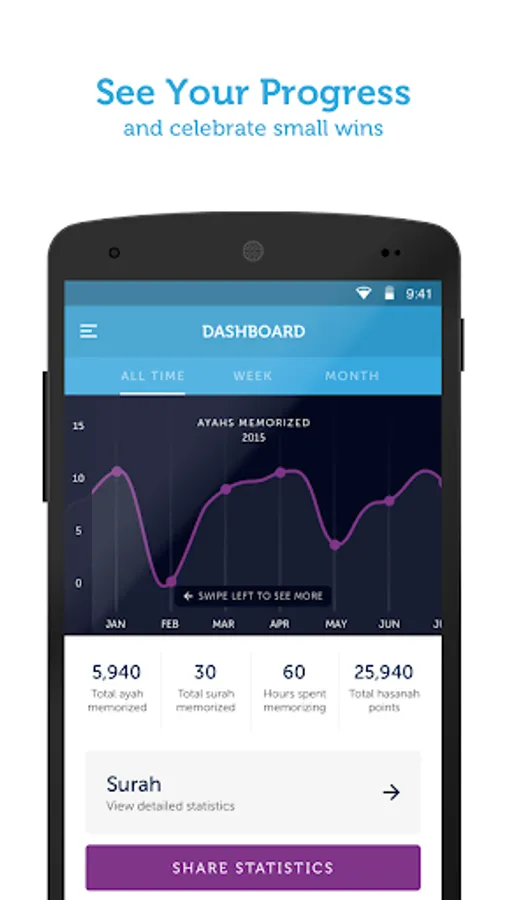 * A powerful analytics dashboard that shows your Quran memorization progress at a glance.