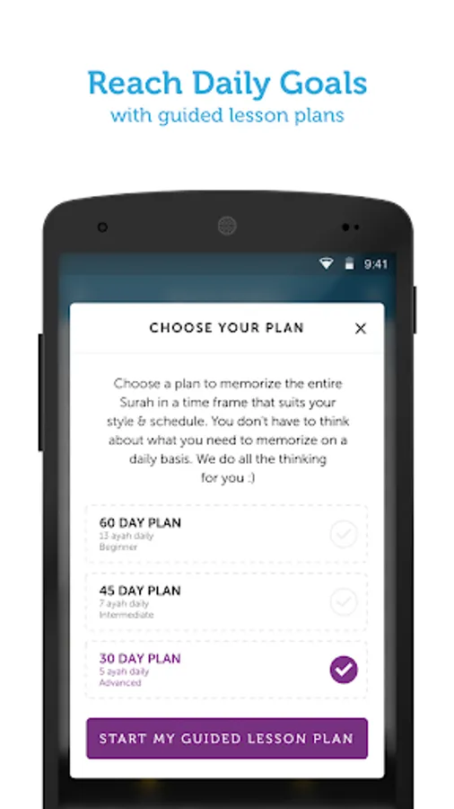 * Personal Challenges: Step up to your goals with our personal challenges feature where you can select a Surah you’d like to memorize or take one of the recommended challenges for you. Choose to take on the challenge with a guided lesson plan, or have it your own way without a guided lesson plan.