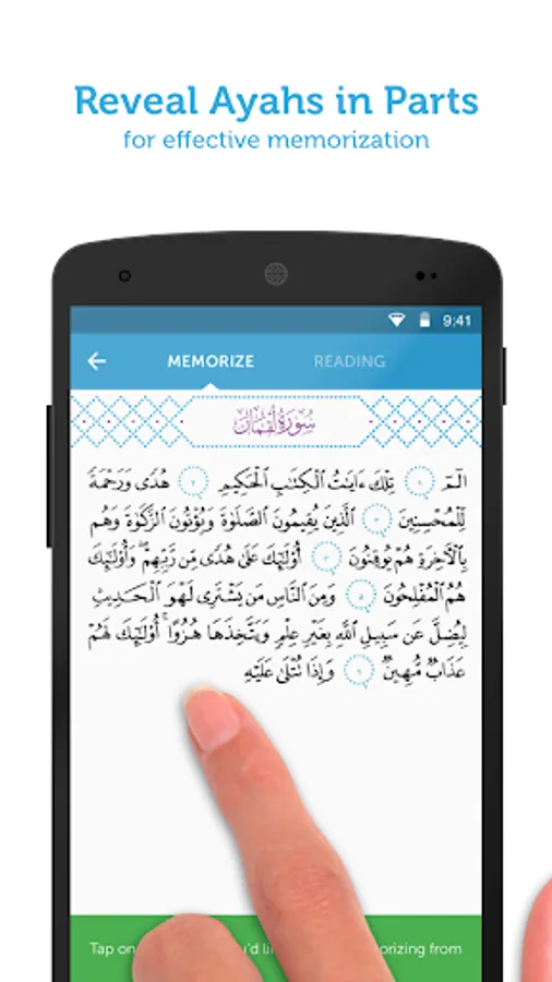 * “Swipe to Reveal” game reveals the hidden ayah as your finger slides across it -- a fun way to practice reciting from memory while checking for any mistakes.