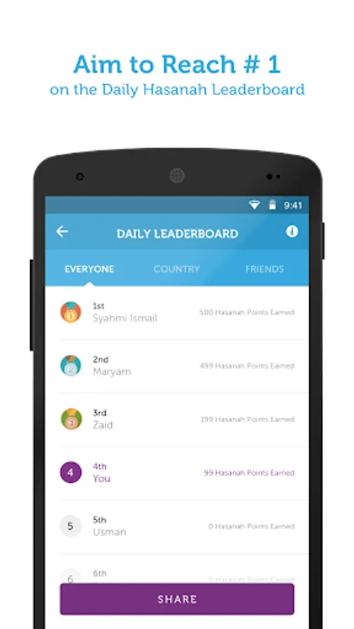 * Daily Hasanah Leaderboard: It is narrated that the Prophet SAW said whoever recites a letter from Allah SWT's Book, receives the reward (Hasanah) of ten for each letter. Our Hasanah Calculator computes your Hasanah points for you as you progress in your memorization. The Daily Hasanah Leaderboard then shows the top 100 users with the highest Hasanah points and gets reset daily! Challenge yourself to be on the board while inspiring others to memorize too.