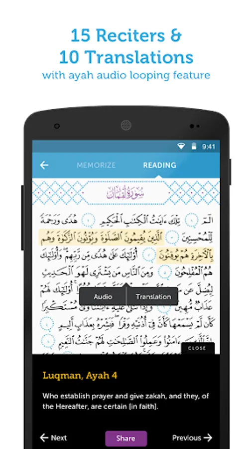 * 15 different audio Quran recitations and 10 different Quran translations (more translations coming soon)