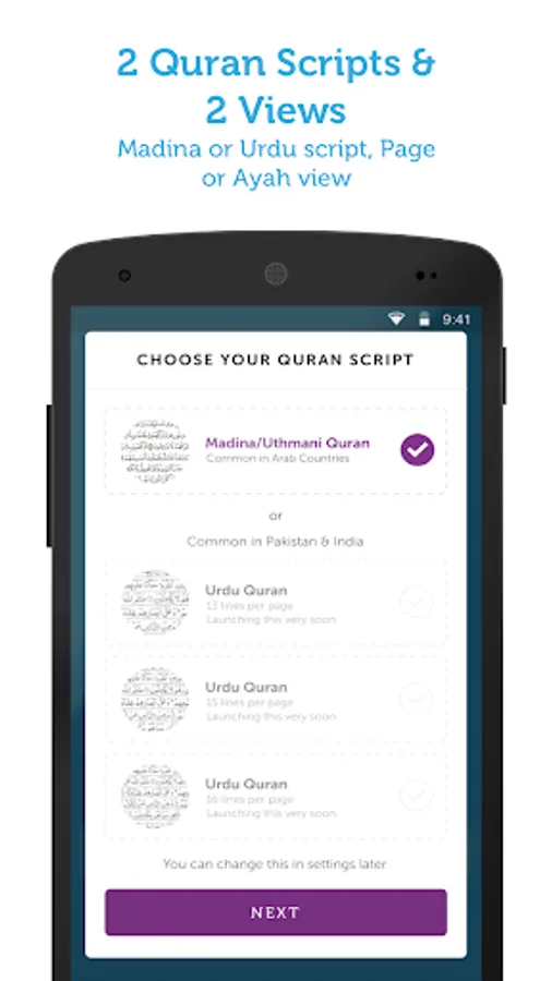 * Customizable display options of Madina/Uthmani or Urdu (IndoPak) script, endless scrolling or single page display, or 13, 15 or 16 lines per page for Urdu (IndoPak) script.
