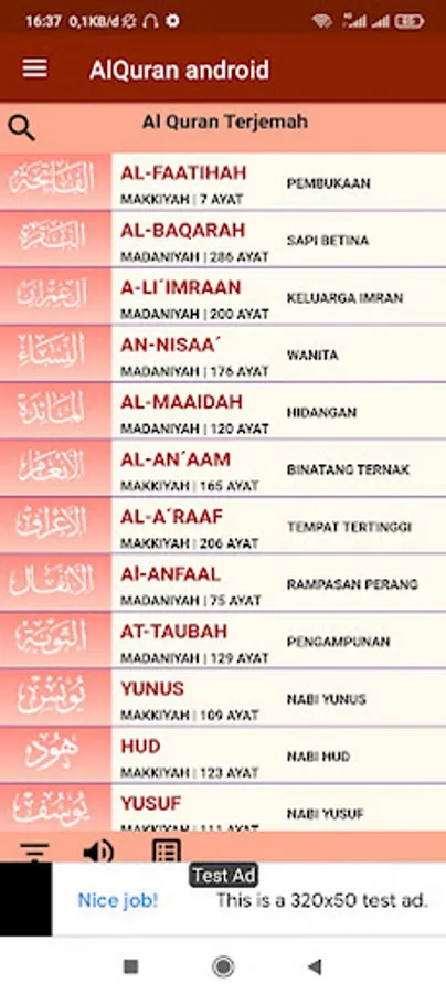 - Indonesian translation, translation options (Kemenag-RI and Tafsir Al Jalalain Indonesia).