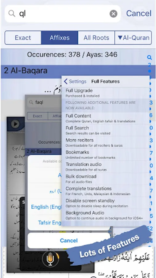 full version contains many reciters, many translations, audio of English, Urdu translations, unlimited bookmarks, background audio, disable standby feature, bulk download & many more features.