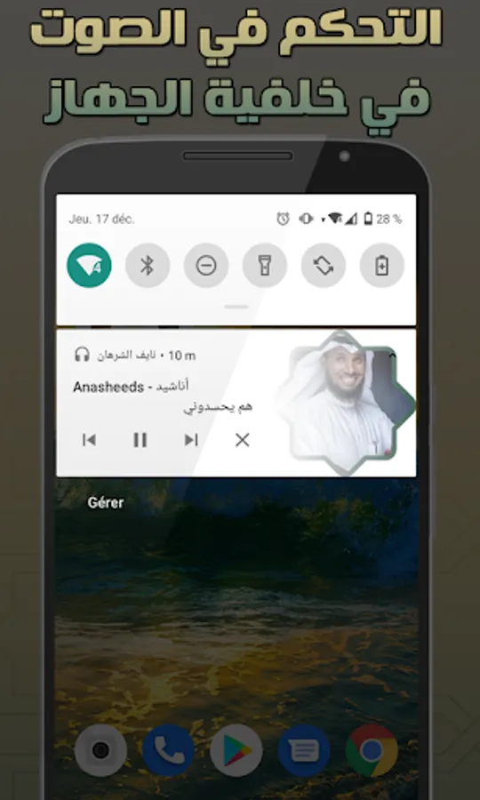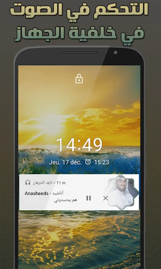 • Listen to the voice of Sheikh Nayef Al-Sharhan in the background of the device and control the volume