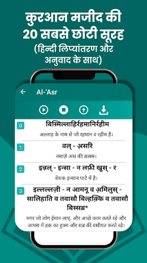 इस Small Surah in Hindi की App में कुरआन की 20 छोटी सूरह हिन्दी में हिन्दी तर्जुमा Small Surah in Hindi with Hindi Translation के साथ दिया गया है।