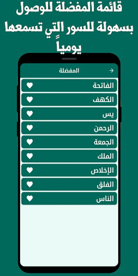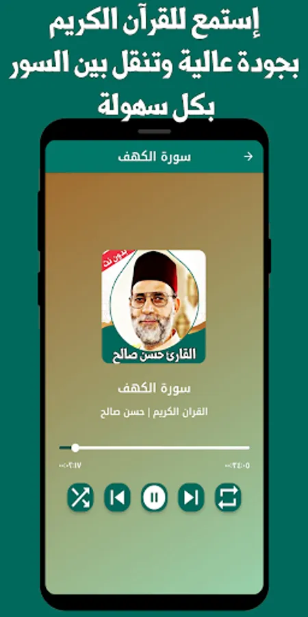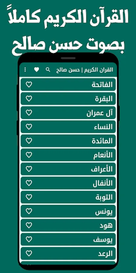 Simple and elegant interfaces, where you can choose the surahs that you like, add them to the list of favorites, and listen to them without the Internet, with the voice of the reciter Sheikh Hassan Saleh, who has a wonderful voice that makes you humble to hear the verses of God.